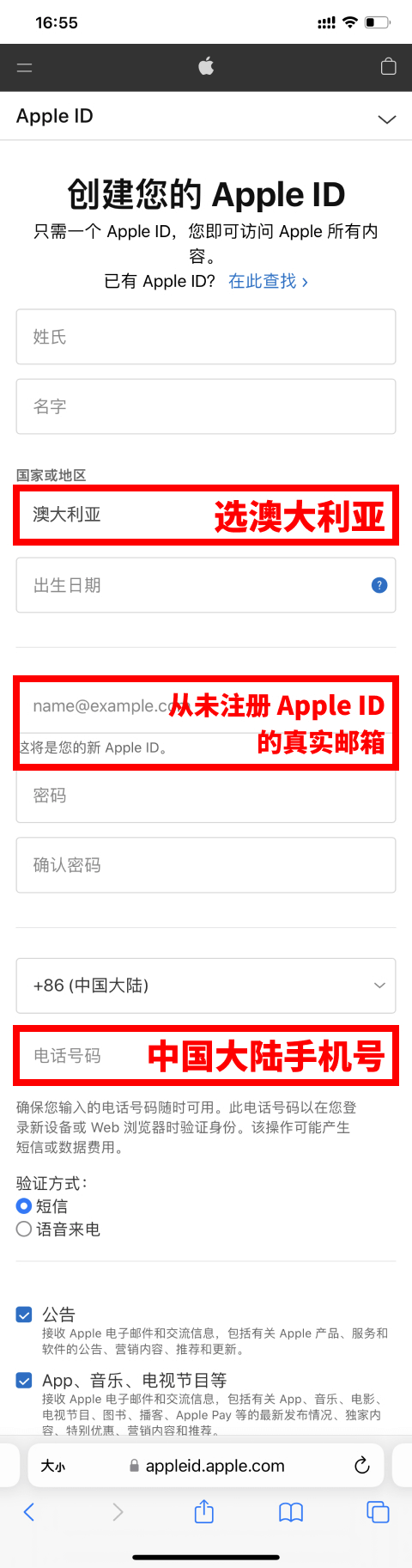 如何注册澳大利亚 Apple ID 1打开 appleid.apple.com选择【创建您的 Apple ID 】 2您需要准备: 邮箱:从未注册 Apple ID 的真实邮箱 手机号:中国大陆手机号 3验证您的邮箱和手机号 4当进入该页面您的澳大利亚 Apple ID 已注册成功 5打开 App Store ,点右上角头像滑到屏幕底部,退出登录 6滑到屏幕顶部,用新建的澳大利亚 Apple ID 登录在弹窗中点【Review】 7同意条款,根据图片提示填写街道、电话、邮编等信息,点【Next】 8至此,您的澳大利亚 Apple ID 已可用 返回
